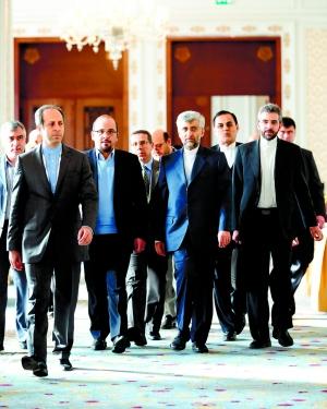 22日,伊斯坦布爾,伊朗首席核談判代表賽義德·賈利利(前右二)參加伊核問題第二天的會談。