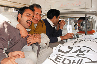 其中一名巴基斯坦死者的遺體送往停尸間時,親人在一旁痛哭。