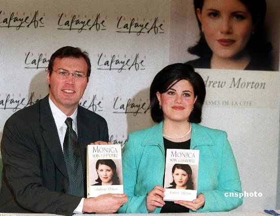 資料圖:2003年4月15日,英國知名傳記作家安德魯·莫頓在法國巴黎舉行宣傳會,與莫尼卡·萊溫斯基一起為他的新作——萊溫斯基傳記作宣傳。幾年前,萊溫斯基因與美國前總統克林頓有染,而成為轟動美國的新聞人物。 中新社發