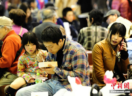 3月12日下午,因受11日日本東北地區大地震影響而滯留東京羽田機場的旅客吃盒飯的同時也在等待最新的航班信息。中新社發 侯宇 攝