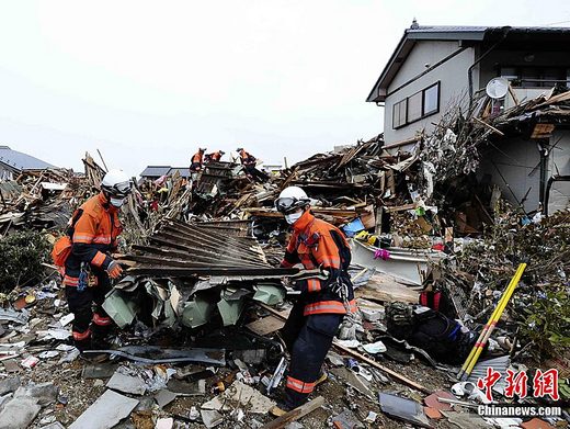 3月16日上午,日本救援隊伍在日本巖手縣大船渡市的“3.11日本東北大地震”引發的大海嘯襲擊后的災區進行搜救工作。中新社發 侯宇 攝