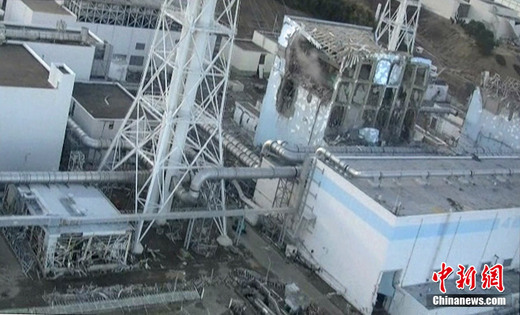 3月16日,由日本自衛隊員在直升機上拍攝的福島第一核電站第四反應堆受損近照。