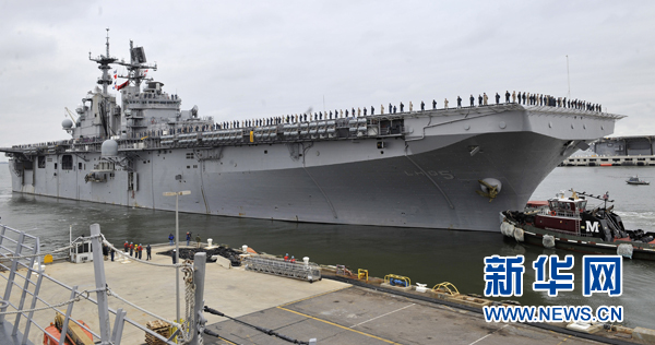 3月23日,在美國弗吉尼亞州諾福克海軍基地,“巴丹島”號兩棲攻擊艦離港。當天,美國海軍派出由“巴丹島”號兩棲攻擊艦、“弗德臺地”號兩棲船塢運輸艦與“惠德比島”號船塢登陸艦組成的兩棲作戰艦隊,攜艦載戰斗機、海軍陸戰隊和醫療設施前往地中海參與針對利比亞的軍事行動。新華社記者張軍攝