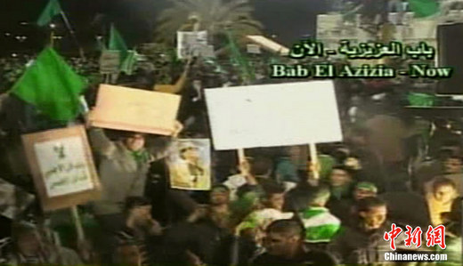 當(dāng)?shù)貢r(shí)間3月22日晚,多國(guó)部隊(duì)對(duì)利比亞發(fā)動(dòng)19日以來(lái)的第4輪空襲。22日深夜,利比亞領(lǐng)導(dǎo)人卡扎菲站在他被導(dǎo)彈襲擊官邸的陽(yáng)臺(tái)上向大批支持者發(fā)表演,指責(zé)西方國(guó)家對(duì)利比亞發(fā)動(dòng)的軍事行動(dòng)是“十字軍國(guó)家對(duì)伊斯蘭國(guó)家發(fā)動(dòng)的新十字軍東征”,并且表示他和他的支持者將在對(duì)反叛武裝和多國(guó)部隊(duì)的戰(zhàn)斗中奮戰(zhàn)到底,取得最后的勝利。圖為利比亞國(guó)家電視臺(tái)的截圖。