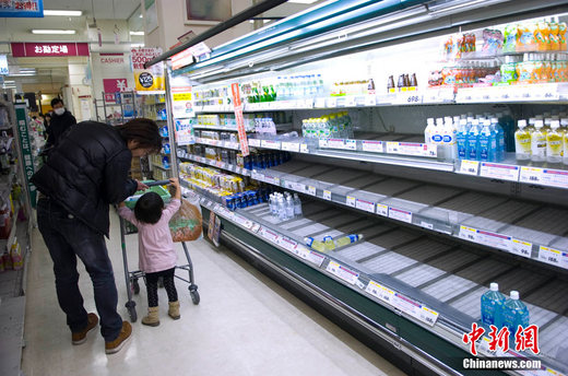 22日記者在超市購買飲用水還只是限購,到了23日,整個超市里瓶裝水已是徹底告罄。24日,記者在一家大型超市守候了近一個小時,終于看到超市工作人員推著裝滿飲用水的箱子重新上架。而還沒等到他將這些飲用水逐一放到貨架上,就被早已等候多時的人們搶購一空。而更多的人選擇到網(wǎng)上購買。在日本最著名的樂天網(wǎng)購網(wǎng)站上,飲用水成為最近成交率最高的貨品。然而因為下單量過多,送貨時間也相應延遲了。
