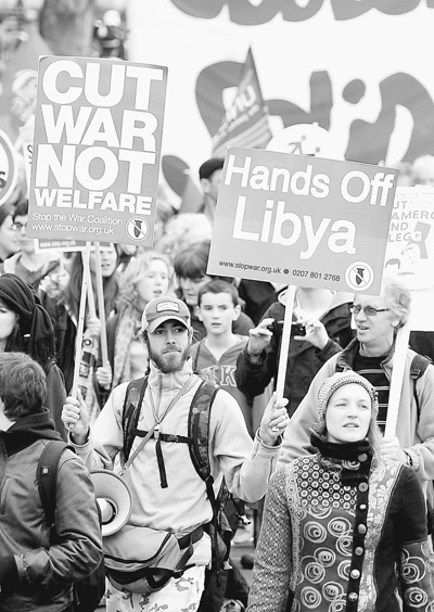 3月26日,在英國(guó)首都倫敦爆發(fā)大規(guī)模游行示威,抗議政府裁減預(yù)算及參與對(duì)利比亞的軍事行動(dòng)等。圖為抗議者打出反對(duì)干涉利比亞的標(biāo)語(yǔ)。 新華社發(fā)