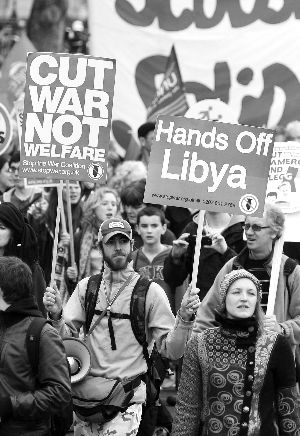 3月26日,在英國首都倫敦,抗議者打出反對干涉利比亞的標語。