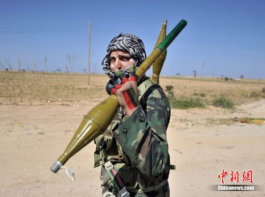 2011年3月23日,利比亞東部重鎮艾季達比耶市郊,一名手持火箭彈的反政府武裝士兵打出“勝利”的手勢。