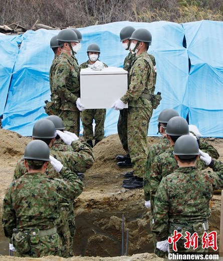 3月22日,日本東北大地震后進入第12天,地震重災(zāi)區(qū)宮城縣東松島市當天早晨集中埋葬多名遇難者。圖為日本地面自衛(wèi)隊人員向即將入土的遇難者致敬。