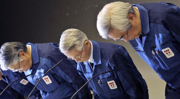 3月30日,日本東京電力公司會長勝俁恒久(中)在東京舉行的新聞發(fā)布會上鞠躬。勝俁恒久當日在此表示,客觀地分析福島第一核電站1號至4號機組的現狀,“可以說不得不報廢”。 新華社/法新