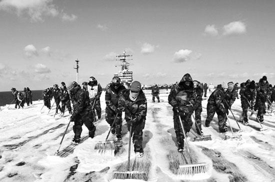 美國(guó)士兵對(duì)里根號(hào)航空母艦進(jìn)行清理作業(yè)