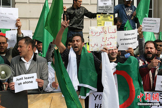 當?shù)貢r間3月29日下午,約40個國家和國際組織的外長及代表在倫敦參加有關利比亞局勢的國際會議,上百名居住在倫敦的利比亞、卡塔爾等國抗議者在蘭卡斯特宮會場外示威,要求西方國家停止轟炸,停止干涉利比亞內(nèi)政。中新社發(fā) 魏群 攝