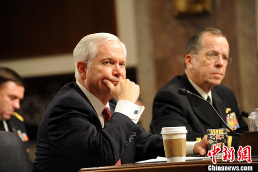 美國國防部長羅伯特·蓋茨、美軍參謀長聯席會議主席邁克爾·馬倫31日上午和下午分別前往國會參、眾兩院作證,為美國對利比亞動武辯護。圖為蓋茨(左)與馬倫當日出席參議院軍事委員會的聽證會。中新社發 吳慶才 攝
