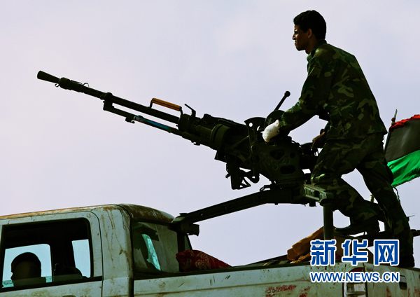 4月6日,在利比亞東部城市布雷加前線,一名反政府軍士兵坐在載有重型機關槍的卡車上。在北約空軍的空襲配合下,反政府軍當天向布雷加發起進攻,但尚不確定是否已攻占布雷加城。新華社記者才揚攝