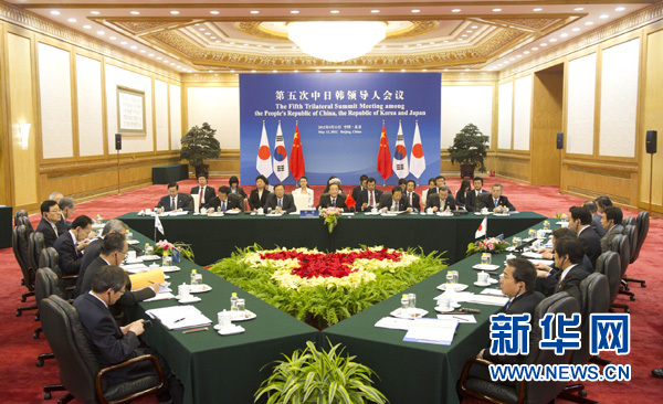 5月13日,第五次中日韓領(lǐng)導(dǎo)人會(huì)議在北京人民大會(huì)堂開始舉行。中國(guó)國(guó)務(wù)院總理溫家寶主持會(huì)議,韓國(guó)總統(tǒng)李明博、日本首相野田佳彥與會(huì)。新華社記者 張鐸 攝