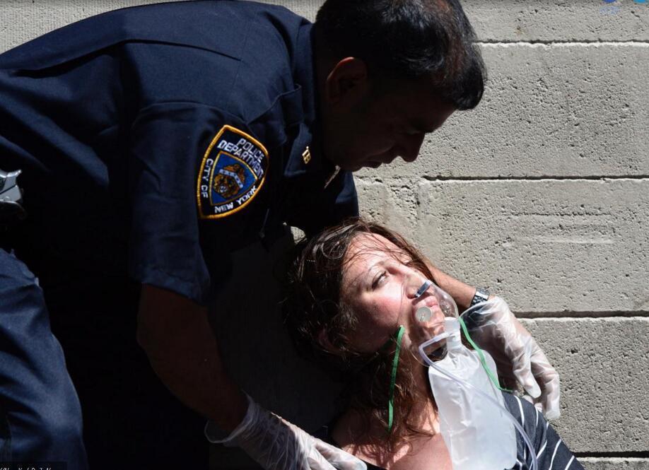官方消息稱這些目前在醫(yī)院中接受治療的人都沒有生命危險(xiǎn)!昂芏嗳司瓦@么走著,然后很快倒在了地上,或是趴在車上、倒在人行道上,”目擊者琳賽說。“他們很明顯地站不穩(wěn)。我看到四輛救護(hù)車開過來!眻D為一警察為疑似吸食K2的女子吸氧。