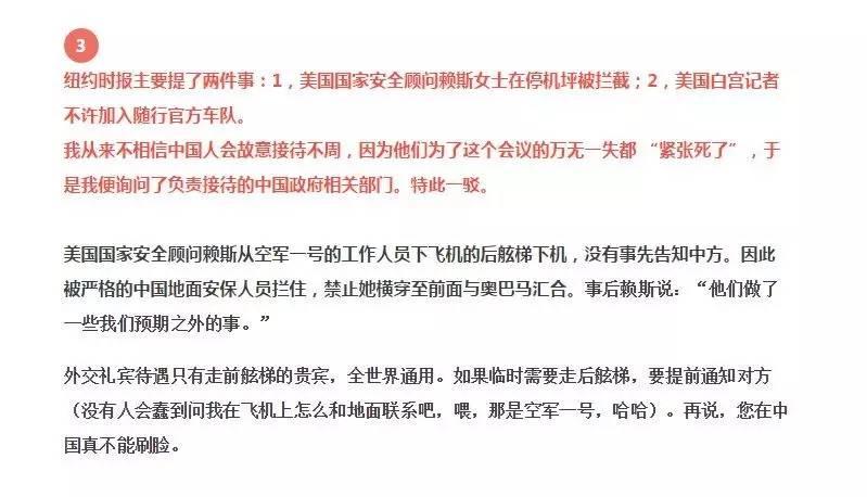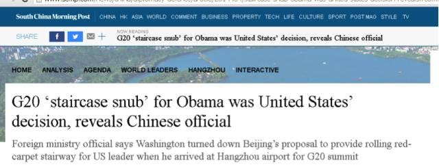 比如,根據(jù)《南華早報》的報道,一名匿名的中方人員透露,真實(shí)的情況是奧巴馬方面嫌中國運(yùn)送樓梯的司機(jī)不懂英文,而當(dāng)中方表示可以配翻譯時又被美方拒絕了,并表示奧巴馬可以從飛機(jī)尾部下機(jī),于是才沒有了前門的樓梯和紅毯。