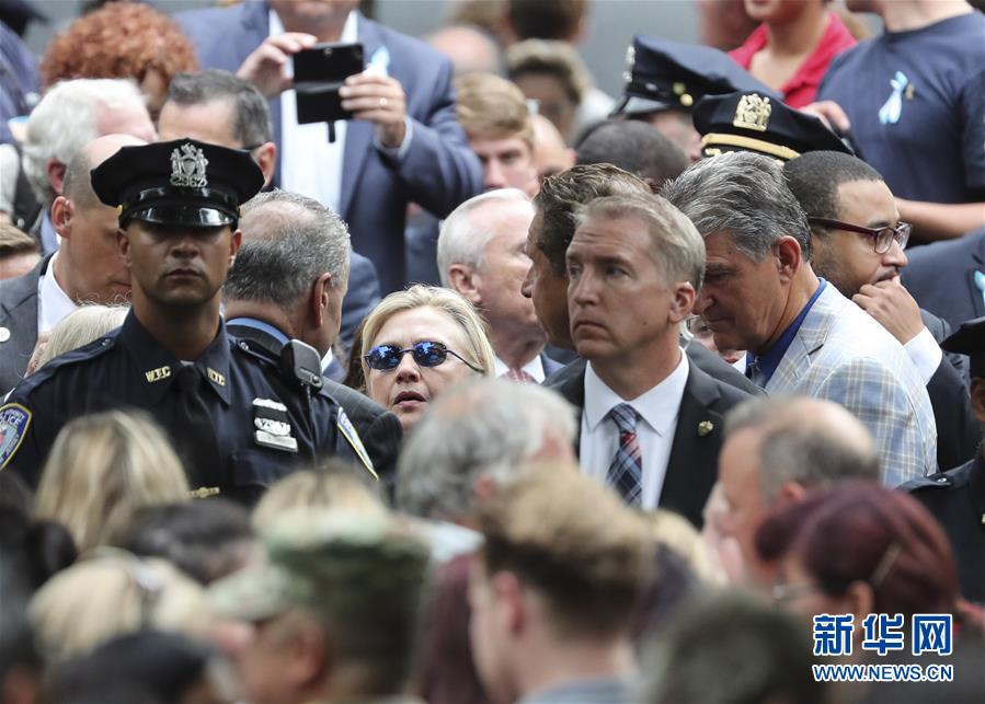 資料圖:9月11日,在美國紐約,民主黨總統候選人希拉里·克林頓(中,戴墨鏡者)抵達活動現場。當天,“9·11”恐怖襲擊事件15周年紀念活動在美國紐約“9·11”紀念廣場舉行。 新華社記者王迎攝