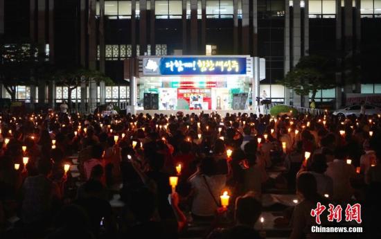 7月31日,美韓當局公布的“薩德”反導系統部署地——韓國慶尚北道星州郡當地的示威活動已經進入第20天。每天都有上千名頭戴“反對‘薩德’”字樣頭巾、高舉“不要‘薩德’要和平”、“美軍離開韓國”等標語的抗議者在郡政府前點燃燭火示威,祈愿和平。 中新社記者吳旭攝