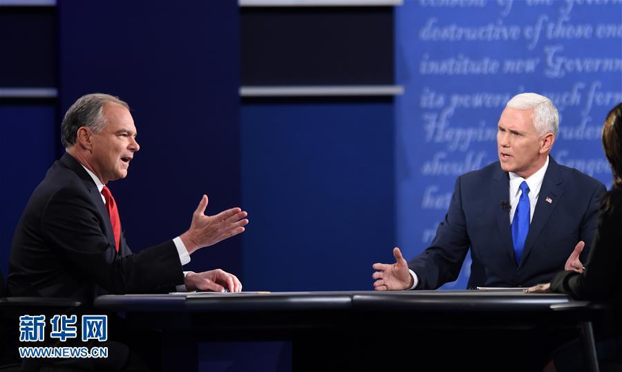 10月4日,在美國弗吉尼亞州法姆維爾的朗伍德大學,特朗普的競選搭檔、共和黨副總統候選人邁克彭斯(右)和希拉里克林頓的競選搭檔、民主黨副總統候選人蒂姆凱恩參加2016年美國副總統候選人電視辯論。新華社記者鮑丹丹攝