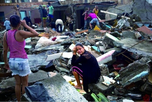截至7日,強颶風“馬修”在海地南部和西北部造成的死亡人數已超過877人。圖為受災的海地居民在倒塌的房屋前。與此同時,“馬修”7日抵達美國佛羅里達州并一路北上,佛州已有至少4人死亡,全州有逾100萬戶停電。