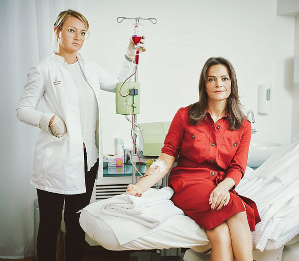 簡(jiǎn)·弗萊爾(Jane Fryer)是其中一個(gè)接受臭氧療法的患者,據(jù)稱(chēng),她本人嚴(yán)重暈血,接受治療時(shí)十分忐忑,但想到這一切都是為了內(nèi)在的美麗,為了讓血液循環(huán)重獲年輕,便覺(jué)得在所不惜。