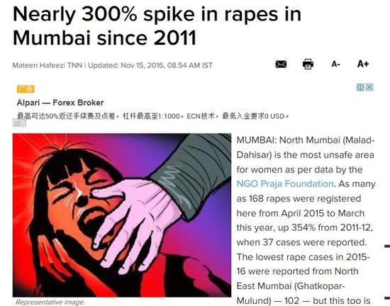 該報道數(shù)據(jù)稱,孟買北部是女性最不安全的地方。從2015年4月到今年3月,那里記錄了168起強奸案,比2011年至2012年度的37起強奸案飆升了354%。強奸案發(fā)生最少的是孟買東北,2015年至2016年度只記錄了102起,不過相比2011年至2012年還是有顯著增加,當時只記錄了22起強奸案。