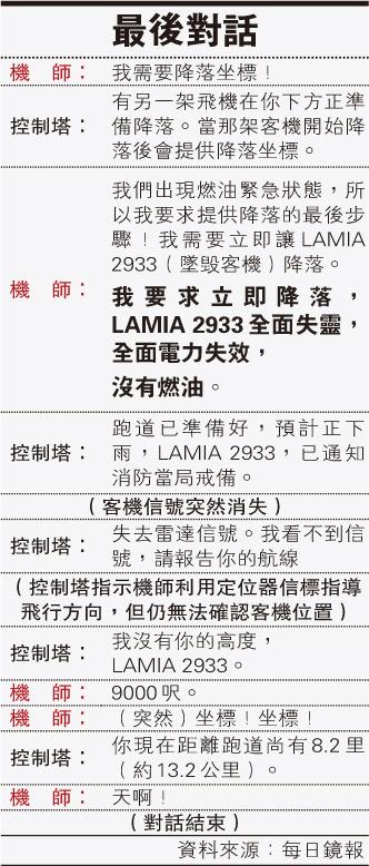 之后這架玻利維亞拉米亞航空公司的包機開始在空中盤旋,機長也越來越絕望。就在上述錄音對話后,飛機開始了4分鐘的死亡盤旋,最終撞向山坡。