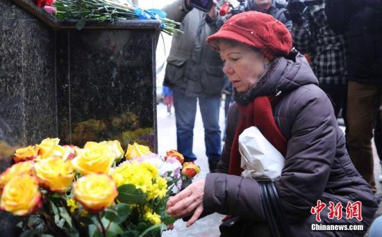 當(dāng)?shù)貢r(shí)間12月25日,俄羅斯民眾在亞歷山德羅夫紅旗歌舞團(tuán)門口為圖—154空難遇難者獻(xiàn)花。中新社記者 王修君 攝