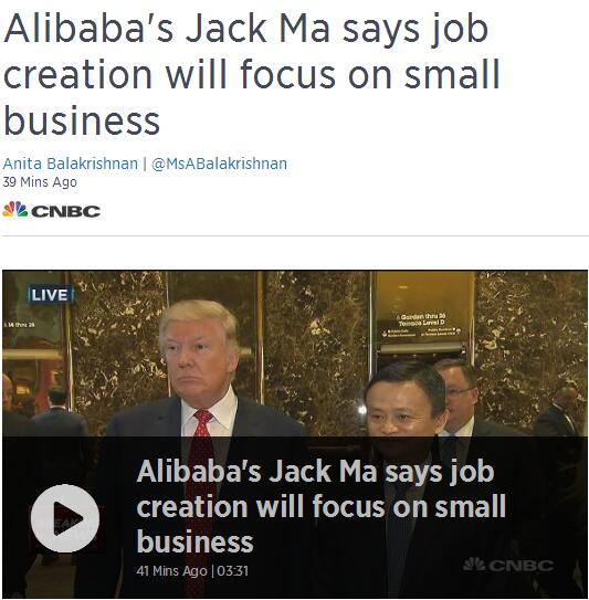 起初,CNBC援引消息人士的話稱,馬云此次會見特朗普,主要是聊阿里巴巴最新的美國擴張計劃。這份計劃包括未來5年在美國創造100萬就業崗位。CNBC顯然對此充滿期待,并將這個點當做標題。