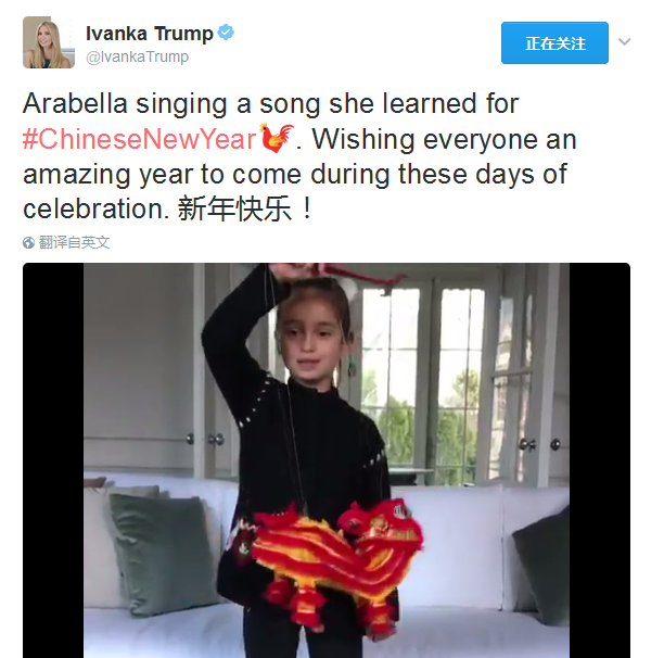 2日一大早,伊萬卡發了這樣一條推文:“阿拉貝拉唱著她從中國新年學到的歌曲,在這節日慶典之際,祝愿每個人都有個精彩的新年。新年快樂!”其中最后“新年快樂”4字是用中文所寫,并配發了女兒用普通話演唱中國歌曲《新年好》的視頻。