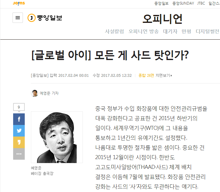 【環球網綜合報道 實習記者 丁潔蕓】最近,一種“中國近期諸多舉動都出于報復薩德”的猜疑在韓國輿論場上傳播,中國強化化妝品安全管理條例、43批韓國產坐便器在華上黑榜、韓居民因照片未達標準被中國拒簽、韓星在中國電視上“消失”等事件都被韓媒解讀為中國對“薩德”的報復。在這種輿論環境下,韓國《中央日報》駐北京總局長芮榮俊2月4日發表了題為“所有事情均咎于‘薩德’?”的文章,提醒韓國不要過度猜忌。現將此文摘編如下: