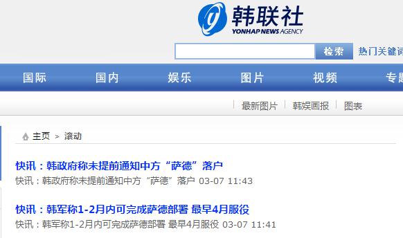【環(huán)球網快訊 記者 趙衍龍】韓聯社3月7日最新消息稱,韓美開始在韓部署“薩德”系統,將經相關程序在星州部署“薩德”系統。韓國政府稱未提前通知中方“薩德”落戶。韓軍稱1-2月內可完成薩德部署,最早4月服役。