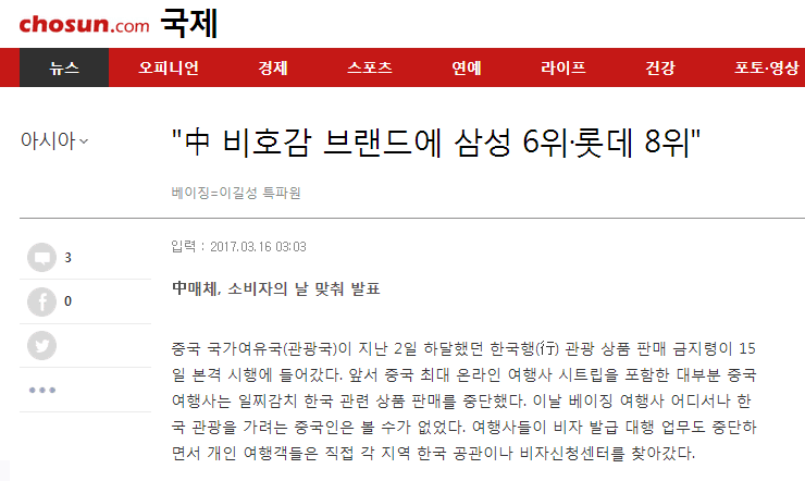 而就在《朝鮮日報》關注到本網所發起的調查報告的前一天,不顧中國堅決反對,執意部署“薩德”的韓國15日剛剛度過了“緊張不安”的一天。當天是韓媒盛傳的“中國旅游禁令正式開始生效”的日子,雖然中方并未證實有相關“禁令”,但諸如“中國游客消失了”“首爾免稅店冷冷清清”“濟州島旅游業者苦不堪言”之類的報道充斥韓國媒體,刻畫出這個國家的滿臉焦慮。3月15日還是國際消費者權益日,韓國企業擔心自己在問題產品榜單上“亮相”。