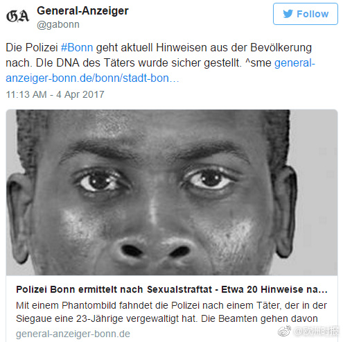 海外網4月4日電 據歐洲時報援引德媒報道,周日(2日)凌晨,在波恩周邊露營的一對年輕情侶遭到“深色皮膚罪犯”持大彎刀威脅。案犯劃破帳篷強迫23歲女子到帳篷外,當著她26歲男友的面將女子強奸。案犯還威脅26歲男友稱“如果敢報警就殺了他”。目前,警方正在通緝嫌犯,據估測嫌犯年齡在20到30歲,身高1.8米。
