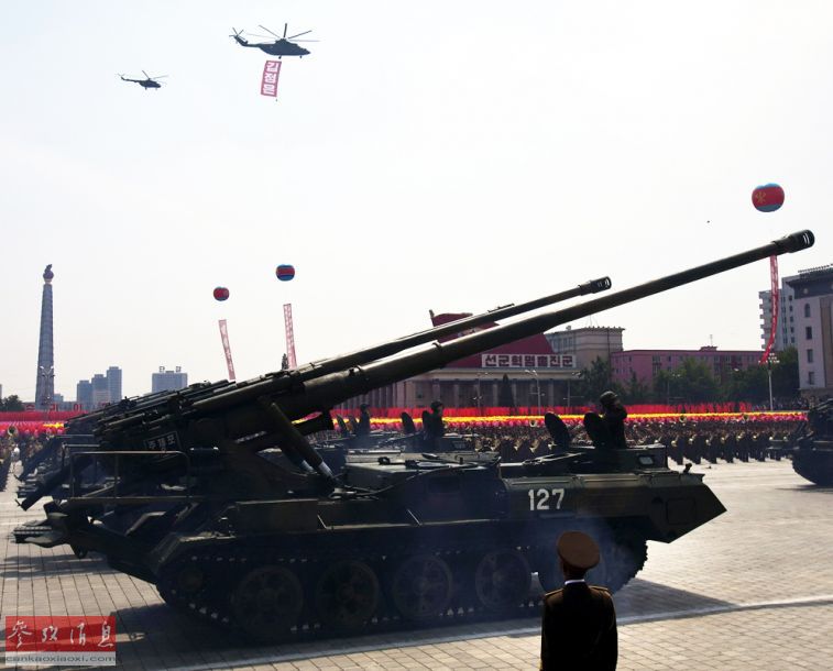 4月15日,朝鮮人民軍在首都平壤舉行了盛大閱兵式,展出了多種新型武器裝備。M1989式170毫米“谷山大炮”方隊(duì),一架米-26重型直升機(jī)正從上空飛過。