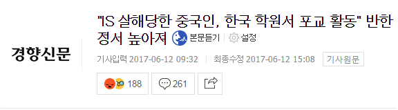 韓國《京鄉新聞》報道稱,被IS殺害的中國人被證實通過韓國人開設的學校進行傳教活動,中國網絡上反韓情緒再度高漲。