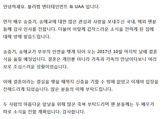 宋仲基所屬經(jīng)紀(jì)公司Blossom娛樂(lè)與宋慧喬所屬經(jīng)紀(jì)公司UAA官方發(fā)表聯(lián)合聲明,內(nèi)容如下: