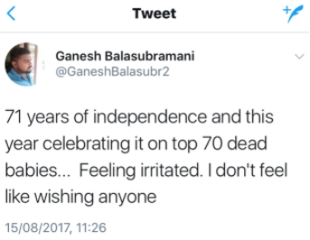 網友@Ganesh Balssubramani:用70個孩子的死亡紀念國家獨立······我感到很憤怒,不想祝福任何人。