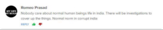 網友@Romeo Prasad:在印度,沒有人關注普通人的生死。所謂的調查只不過是為了將此事掩蓋。這種事情在腐敗的印度是再正常不過。