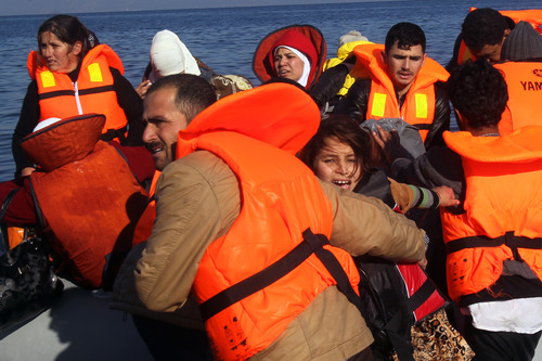 2015年11月8日,來自敘利亞和阿富汗的難民乘坐小船抵達希臘的萊斯沃斯島。新華社發(馬里奧斯·羅洛斯攝)