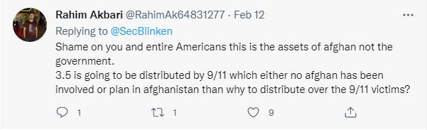 網友Rahim Akbari在美國國務卿布林肯推特賬號下評論,“為你(布林肯)和所有美國人民感到羞恥,這是阿富汗人的資產,不是政府的。阿富汗人沒有參與‘911',為什么要把他們的35億資產分配給‘911'的受害者”?