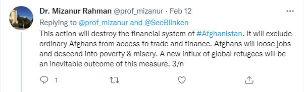 網友Dr. Mizanur Rahman認為,這一行動將摧毀阿富汗的金融體系。它將把普通阿富汗人排除在貿易和金融之外。阿富汗人將失去工作,陷入貧窮和痛苦。