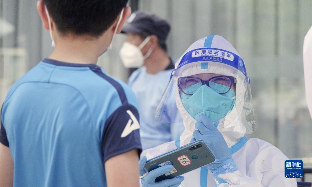 5月2日,在北京市朝陽區八里莊街道紅廟北里社區,醫護人員在管控區為居民進行核酸采樣。新華社記者 鞠煥宗 攝