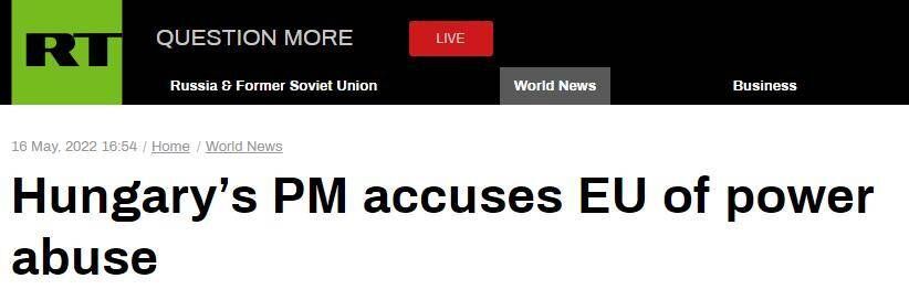 此外,RT還稱,歐爾班在評論歐盟準備對俄羅斯實施的第六輪制裁措施時向國會保證,只要不威脅匈牙利的能源安全,匈牙利就不會妨礙對莫斯科實施新的限制。歐爾班還認為,布達佩斯應該在歐盟內部保持獨立的政策,他認為北約成員國也該如此。