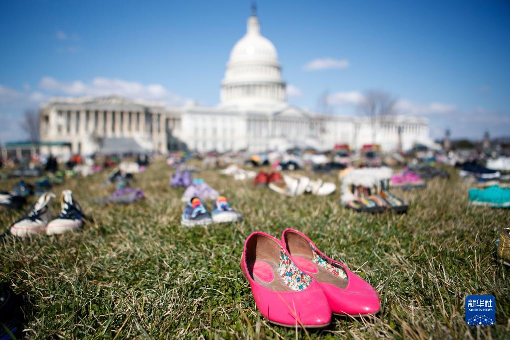 2018年3月13日,7000雙代表自2012年美國康涅狄格州桑迪胡克小學槍擊案以來槍擊事件中遇難兒童的鞋子擺放在華盛頓國會山前的草坪上。人們以這種無聲的方式,抗議國會面對槍擊頻發現狀的不作為,呼吁槍支改革以保障兒童安全。新華社發(沈霆攝)
