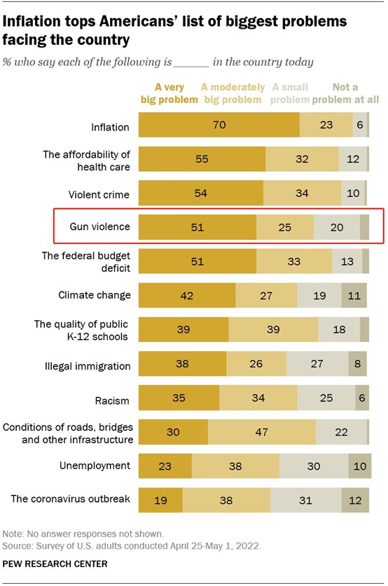 皮尤研究中心2022年4月進行的調查顯示,有76%的美國人認為槍支暴力已成為美國面臨的“很嚴重或比較嚴重的問題”。圖片來源:皮尤研究中心網站截圖
