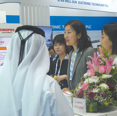 在阿聯(lián)酋阿布扎比國際石油展上,中方工作人員向外國客商介紹易派客平臺(tái)。