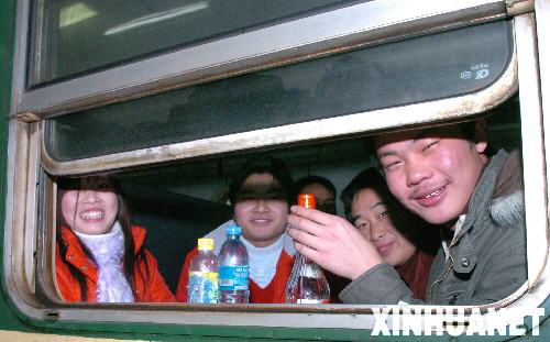 1月31日,幾名乘客登上廣州火車東站開往洛陽的列車后露出笑容。 經(jīng)鐵路部門全力調(diào)度,目前京廣鐵路運輸秩序正逐步恢復。鐵道部支援廣鐵集團的第一批28列列車1月30日已全部上線運行。 新華社記者 壯錦攝
