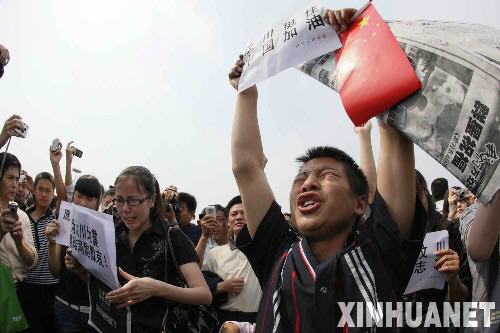 其中的一名學生說:“作為中國人,我們必須團結起來,中國一定能行!”廣場上自發游行的人員都高舉中國國旗和“重建四川”的標語。